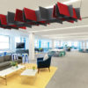 Absorb hanging rafts are a high-quality Class A acoustic absorber. Rafts are excellent at battling reverberation and echo and should be suspended directly above the noise source for optimal performance. The Absorb panel core is an open-cell 65% recycled PET panel which is lightweight and easy to suspend, finished in a wide range of industry-leading Camira fabrics or used in its raw material for a cost-effective solution.